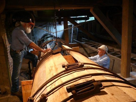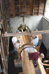 In order for the stream's water to make the turbine spin, and thus make the turbine output drive shaft turn, the "height" of the water must be maintained above the turbine inlet. That "height" of water is called the hydraulic (or "driving") head, and must be high enough to meet the turbine manufacturer's specifications for proper turbine operation. The driving head overcomes the inertia/friction of the turbine and associated shafting/ loads. The level of water is established at Ben's Mill by having a timber dam behind the mill. Water is directed from this mill pond into the turbine inlet. To establish water flow through the turbine, a gate is manually opened, allowing water to enter the penstock (a wooden cylindrical waterway/tube). The penstock directs the water to the turbine inlet, and when the Machinery Operator opens the turbine inlet valve, water flows through the turbine. The force of the water against the turbine wheel blades causes the turbine output drive shaft/main line shaft to spin. Water exits the turbine discharge and flows back into the river, downstream of the dam.