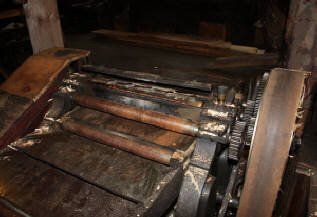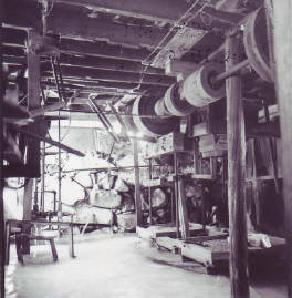 This historic mill is outfitted with machinery dating back to the late 1800's. All of the machinery is designed to be belt-driven. Pulleys of varying sizes are located on the line shafts (below the main floor). These pulleys are aligned with the drive pulleys attached to the machinery on the floor above the line shafting. Using fabric belts looped around the pulleys, the rotation of the line shaft is transferred to the machinery drive shafts, causing the machinery to operate. Individual machine drive belts are engaged by Operator levers, which cause the belt to tighten around both the drive pulley and the machine pulley. The pulley diameters determine the speed at which the machines operate. They basically convert the slower line shaft speed to a higher machinery speed.
